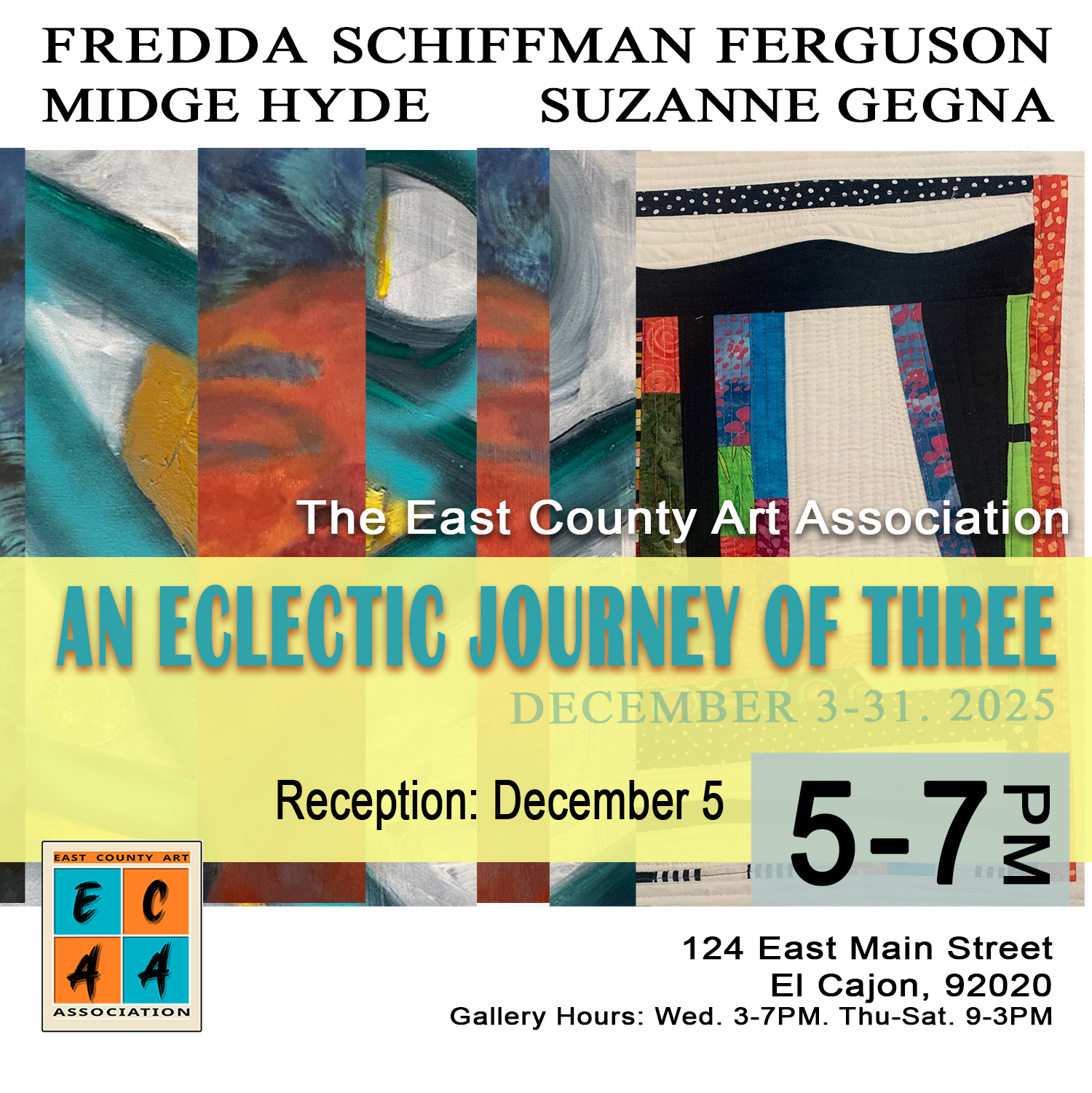 Artists Midge Hyde, Suzanne Gegna, and Fredda Schiffman Ferguson are longtime friends whose creative paths first crossed through the Women’s Caucus for Art and On the Edge Art Gallery. Though their artistic styles are distinctly individual, their shared passion for art, nature, animals, and creative expression unites them. Together, they invite viewers to experience An Eclectic Journey of Three, a celebration of friendship and artistic diversity, on view at the East County Art Association Gallery on Main Street, El Cajon, from December 3–31.